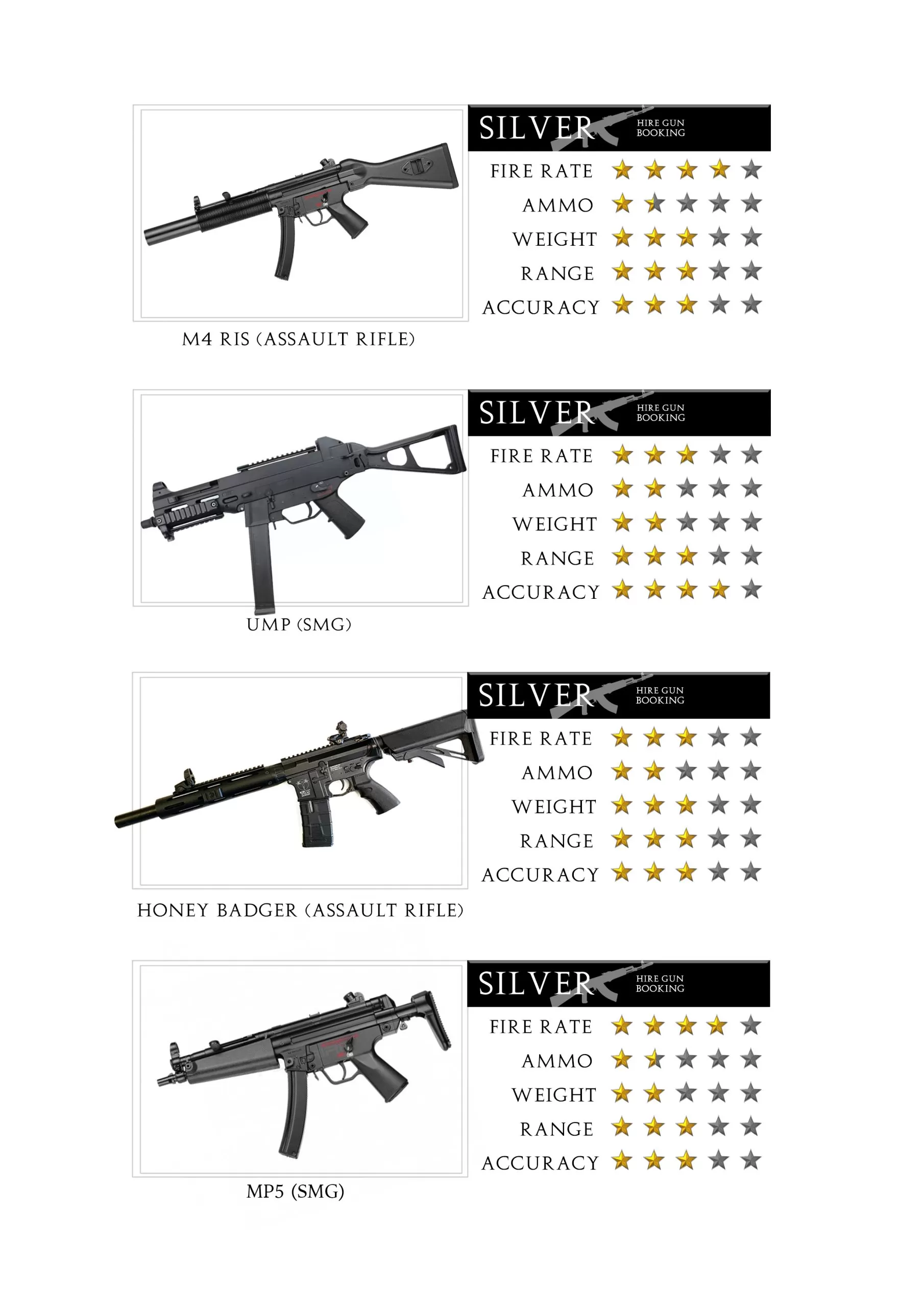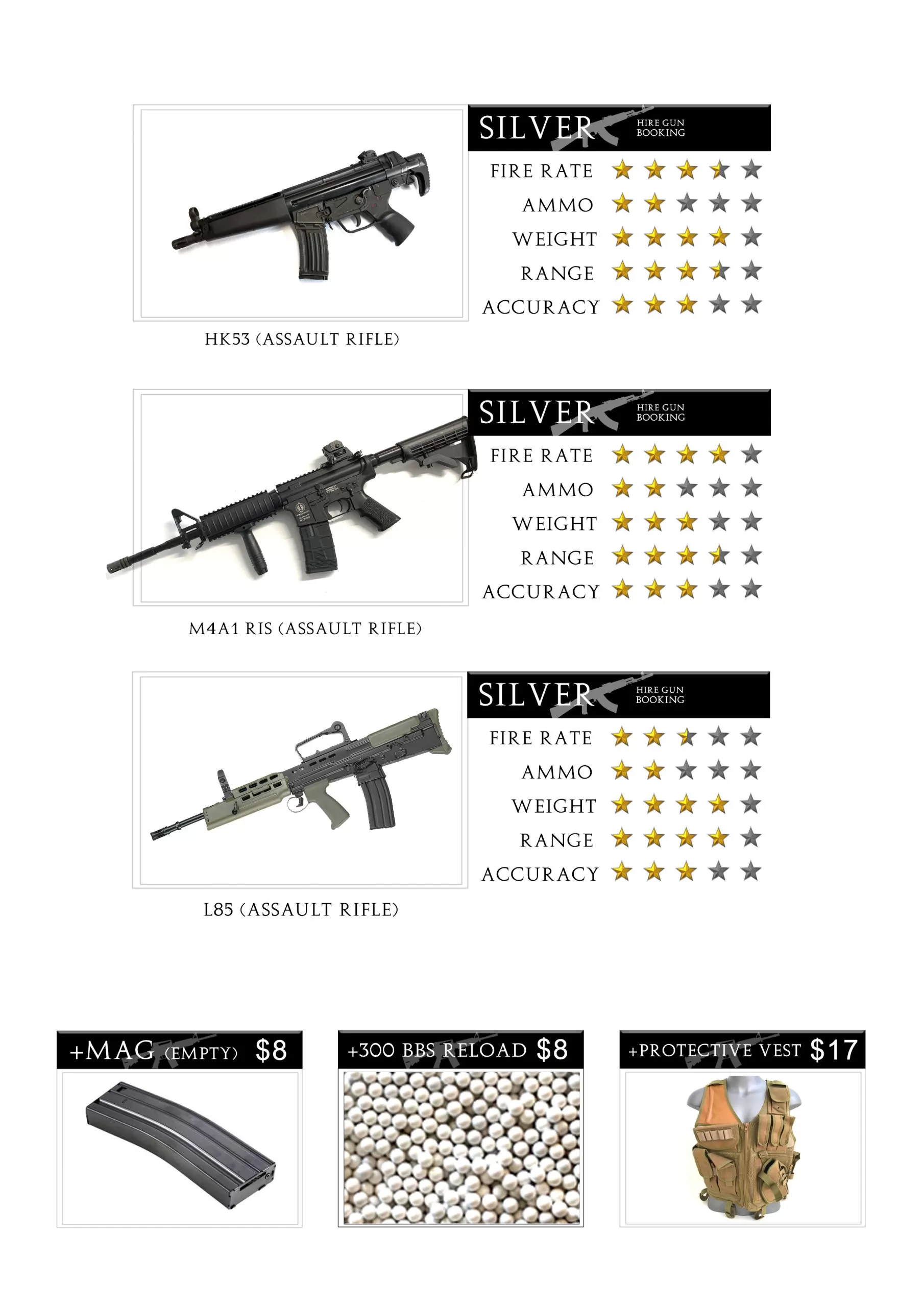The Silver grade Airsoft Guns are an improvement over the Bronze, with a larger selection and higher specification Electric Guns. The ammo we provide with the Silvers are a more consistent grade, which means improved accuracy.